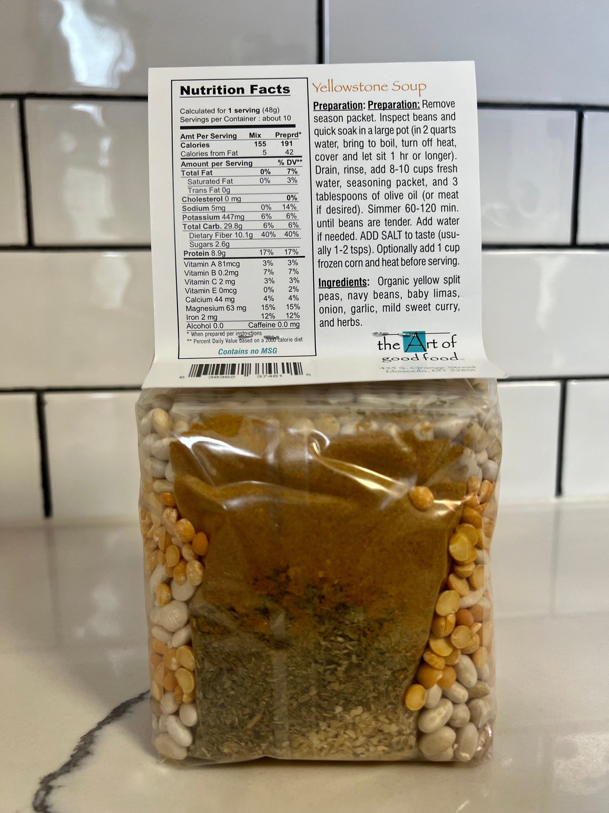 Our own mild curry blend of eight spices and saffron plus other exciting spices and herbs gives this hearty soup a unique and savory flavor. The combination of three different beans also creates a delightful texture and a hearty meal.